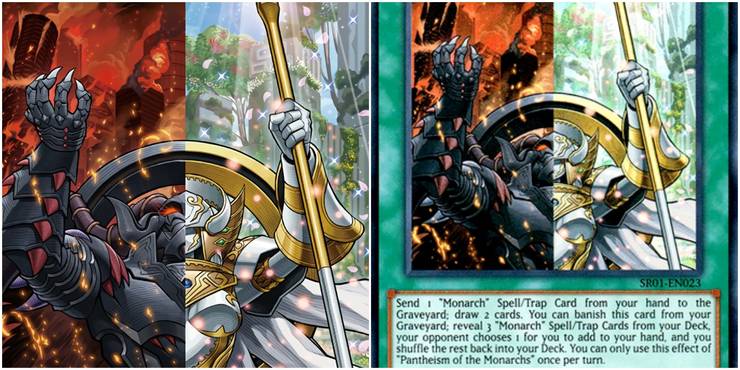 Derzeit begrenzt, „Pantheismus der Monarchen“ ist ein fantastischer archetypischer Zeichnungszauber. Indem du einen „Monarch“-Zauberspruch oder eine „Monarch“-Falle von deiner Hand auf den Friedhof legst, kannst du 2 Karten ziehen. Zusätzlich kann sich „Pantheismus der Monarchen“ verbannen, um deiner Hand einen „Monarch“-Zauber oder eine „Monarch“-Falle hinzuzufügen, indem du deinem Gegner 3 zur Auswahl zeigst.