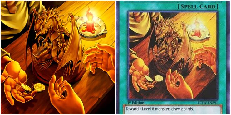 Die ursprüngliche Draw 2-Zauberkarte „Pot Of Greed“ ist immer noch der beste Draw 2-Zauber, der jemals gedruckt wurde. Es ist seit Jahren verboten und viel zu gut, um jemals verboten zu werden. Es gibt absolut keinen Nachteil von „Pot Of Greed.“