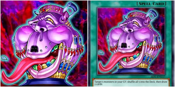 Einer der vielen spirituellen Nachfolger von „Topf der Gier“, „Topf der Habsucht“, erlaubt seinem Benutzer, 5 Monster von deinem Friedhof in das Deck zurückzumischen, um 2 Karten zu ziehen. Dies macht „Pot Of Givice“ zu einem großartigen Werkzeug für Archetypen wie „Sky Striker“ und „Zoodiacs“, um ihre Monster zu recyceln.