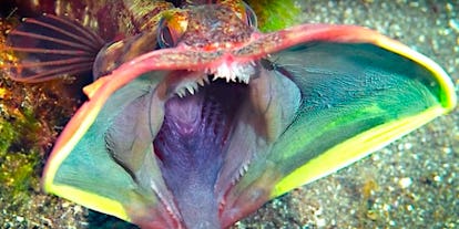 Le Fringehead sarcastique semble relativement inoffensif lorsqu’il n’est pas provoqué et ne possède en fait aucune menace pour les humains. Cependant, lorsque ce poisson long de pied est agité, il ouvre sa bouche massive pour tenter de repousser les prédateurs. C’est cette tactique de défense qui est à la fois surprenante et effrayante.