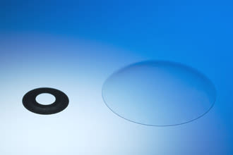 Kamra hornhinneinnlegget (venstre), vist her ved siden av en gasspermeabel kontaktlinse. (Bilde: AcuFocus)